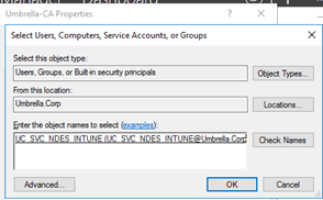 Search for your Intune NDES service account and click on the Ok button. |