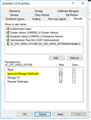 Permissions on CA for Intune NDES service account