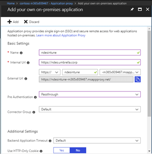 You have already installed the Azure Application Proxy connector on a server. Now we need a proxy app in Azure Active Directory. This app will proxy the request to the NDES server. During the creating of the app, you get an external URL. You need this URL if you creating the SCEP profile in Intune.