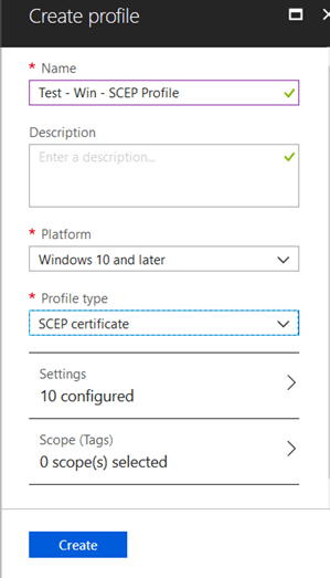 Give the profile a name. Platform is Windows 10 and later. Profile type is SCEP certificate.