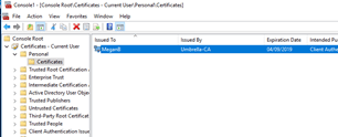 Open MMC via Run and add the Certificates snap-in. This time you have to choose My User account instead of Computer Account. In Personal, you see the certificate, which is enrolled by Microsoft Intune.